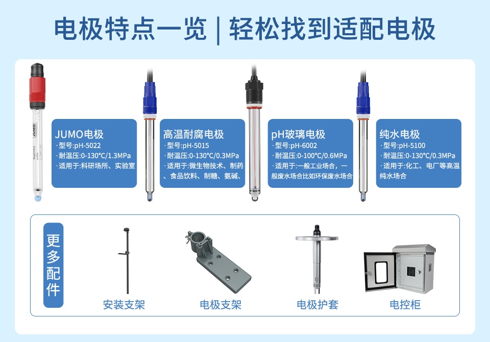 產品描述:pH 電極測量原理為電化學法,原電池原理。原電池是一個系統,它的作用是使化學能量轉成為電能。此電池的電壓被稱為電動勢(EMF)。此電動勢(EMF)由二個半電池構成。其中一個半電池稱作測量電池,它的電位與特定的離子活度有關;另一個半電池為參比半電池,通常稱作參比電極,它一般是與測量溶液相通,并且與測量儀表相連。通過電極內部原電池反應產生的電勢差,傳遞到 pH 控制器,對應算法變送顯示 pH 值。