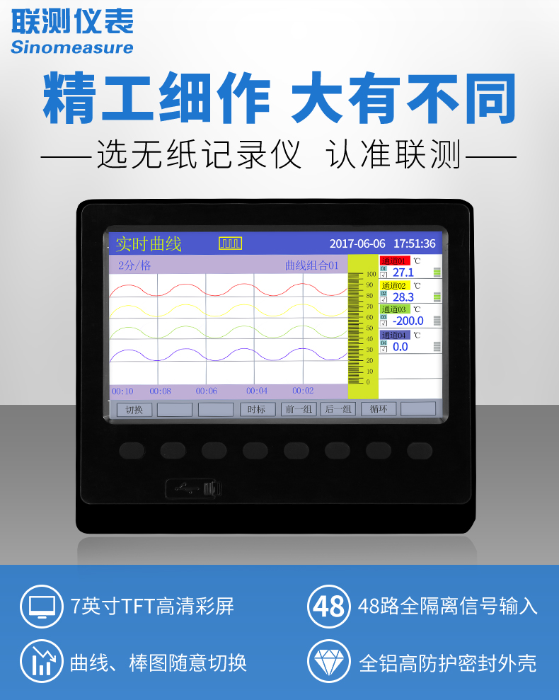 產品名稱:聯測_SIN-R6000C/4000C_1~48路可選_7英寸寬屏_彩色/藍屏_記錄溫度/壓力/電流/電壓/頻率多種參數