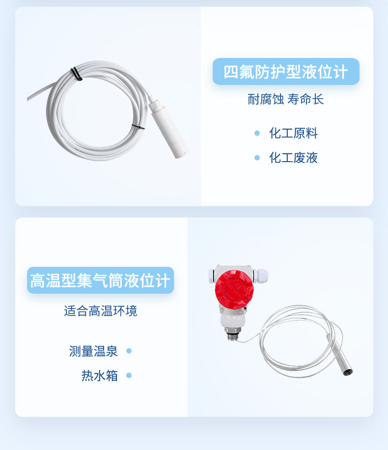 產(chǎn)品描述:防腐投入式液位變送器由高性能陶瓷壓力傳感器作為測量元件,把與液位深度成正比的液體靜壓力準(zhǔn)確的測量出來,并經(jīng)過信號調(diào)理電路轉(zhuǎn)換成標(biāo)準(zhǔn)的電流、電壓或 RS485 信號輸出,建立起輸出信號與液位深度的線性對應(yīng)關(guān)系,實現(xiàn)對液體深度的測量。產(chǎn)品采用聚四氟乙烯防腐材質(zhì),具有優(yōu)良的耐腐蝕性能,廣泛適用于化工廠酸、堿性等腐蝕介質(zhì)的液位測量。