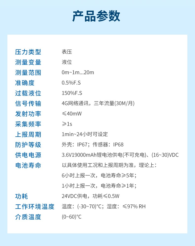 產品描述:無線投入式液位計是基于 4G 無線通訊網絡使液位的測量、變送、上報為一體的低功耗智能儀表。集成高靈敏度液位檢測元件,高精度信號調理電路,低功耗電池電源管理,豐富的 LCD 顯示界面于一體。周期性上報液位測量值、電池電量、信號質量等數據,并且能夠當液位超出設置范圍時及時報警,提前預警故障隱患。本產品適合油田、水利、消防管網、自來水管網、城市供熱管網等智慧城市應用場景。